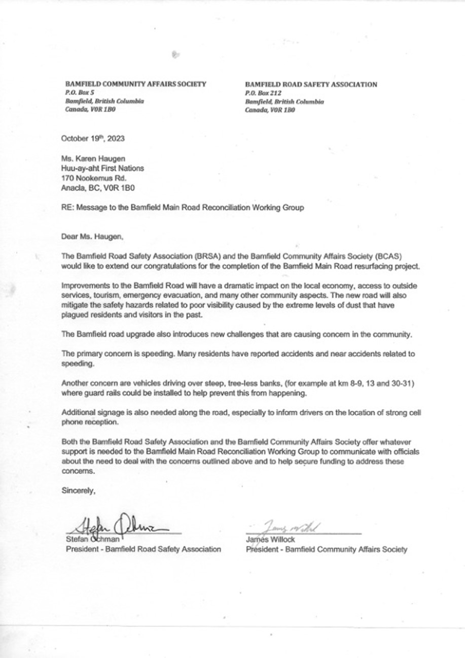 Jamie Willock of BCAS and Stefan Ochman of the Road Safety Association sent a letter on October 19th regarding safety concerns on the newly sealed road as was requested at September’s BCSA meeting.